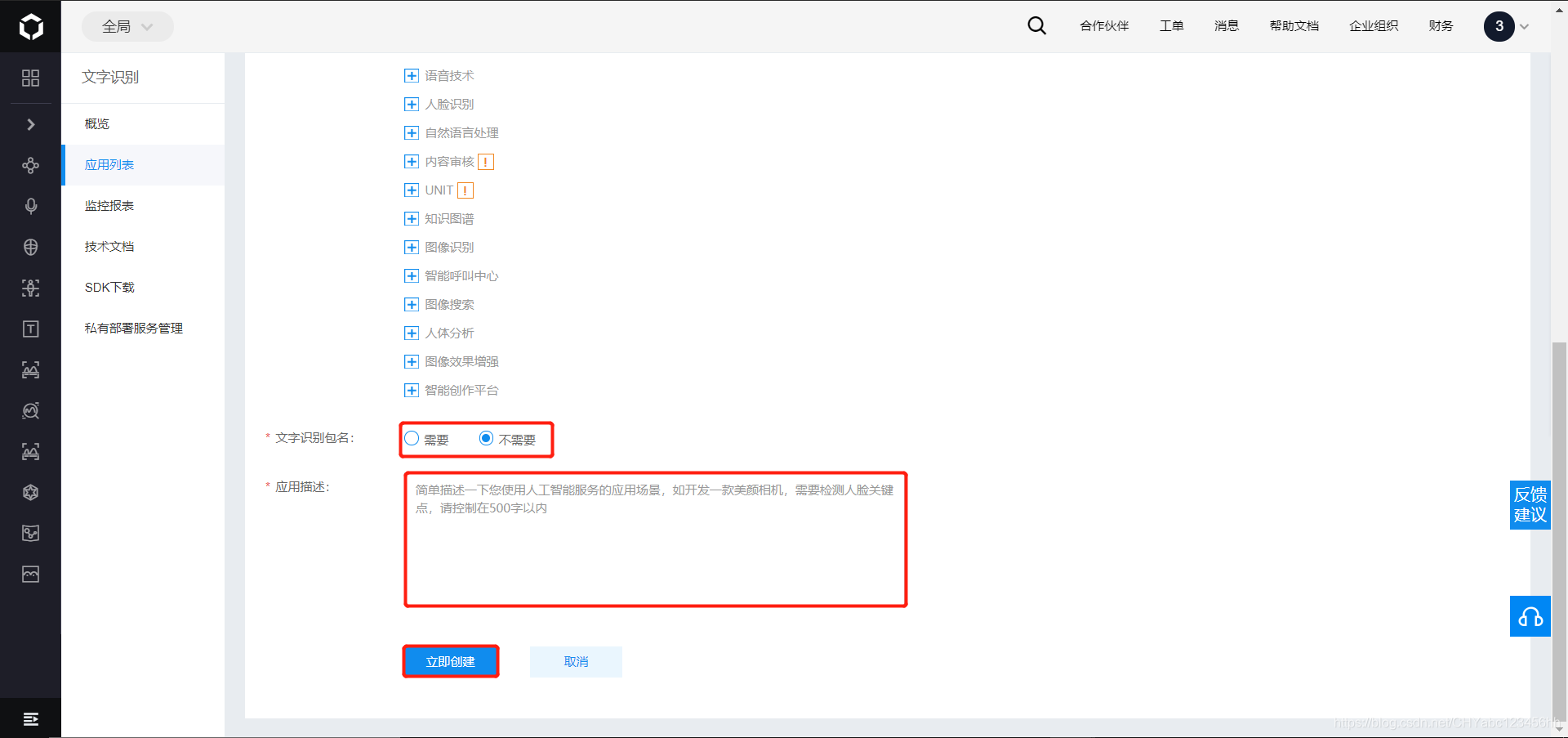 - 输入应用的描述,文字识别的报名选择不需要,然后点击立即创建