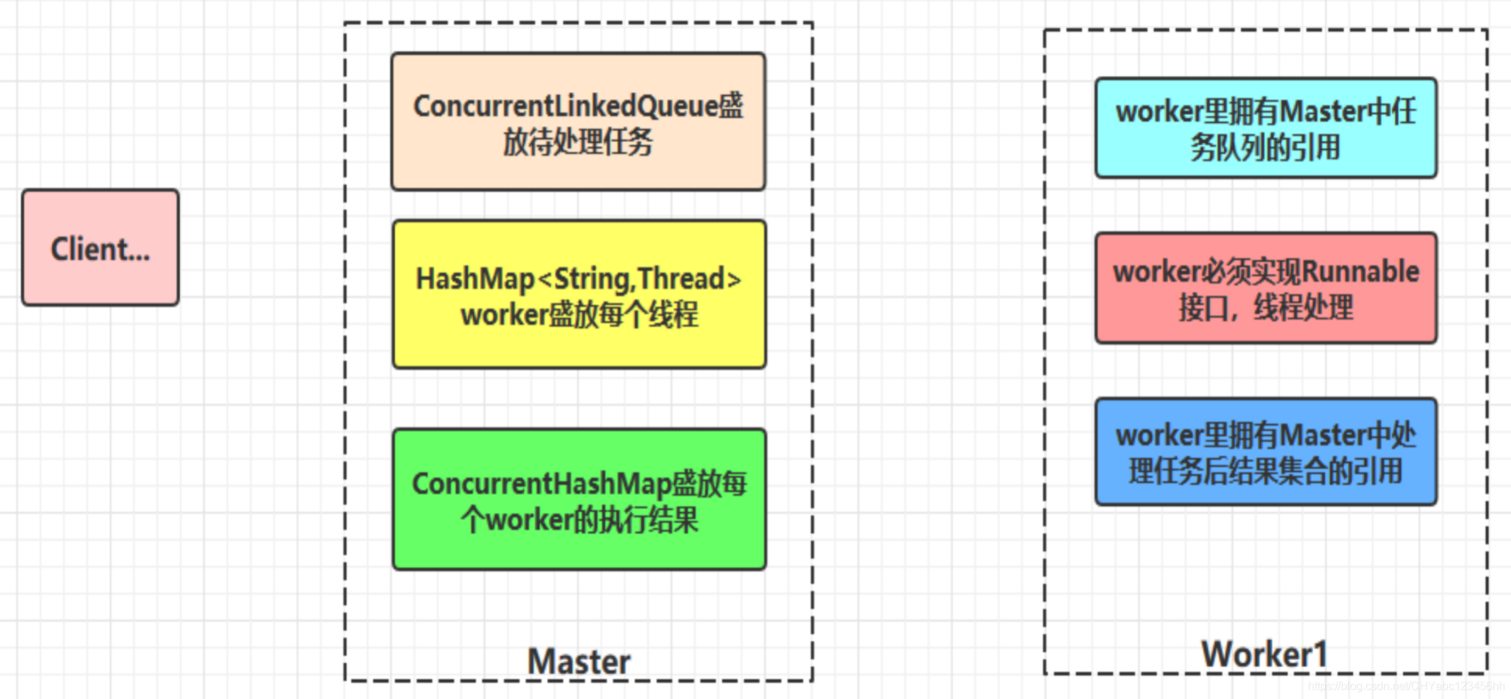 - master里面用ConcurrentLinkedQueue盛放待处理的任务和HashMap<string,Thread>盛放每个线程,以及将每一个worker的执行结果存放在ConcurrentHashMap 中