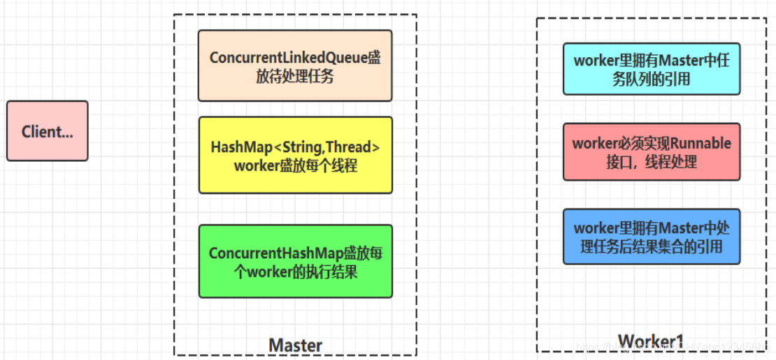 - Master-Worker模式是常用的并发计算模式,他的核心思想是系统由两类进程协作工作:Master和aworker进程