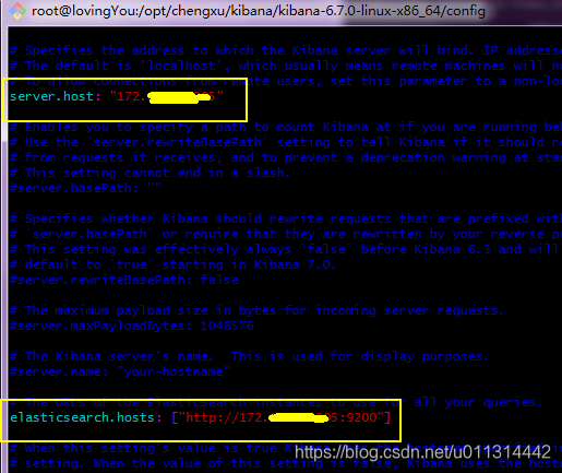 3. 修改 2 处关于 IP 的配置为自已安装 elasticsearch 服务器的内网 IP。