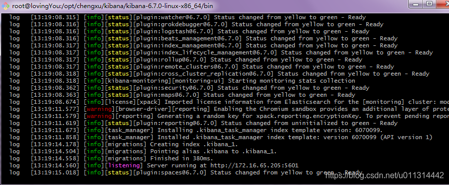 4. 回到 kibana 的bin 目录下,执行 ./kibana 启动它。(要先启动好 elasticsearch )