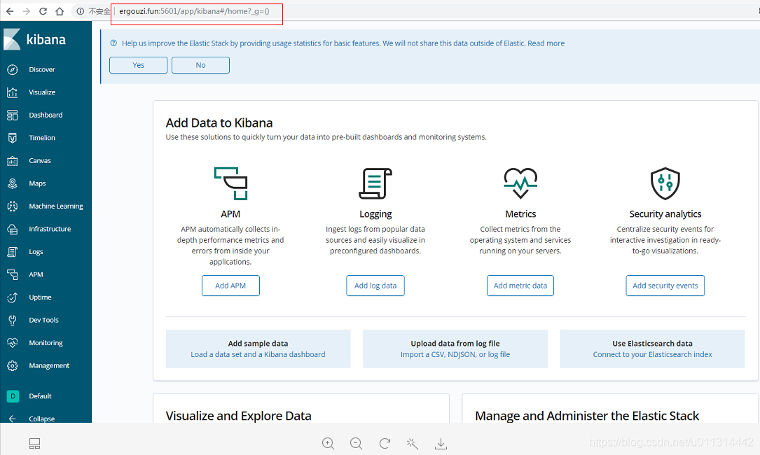 5. 浏览器访问,kibana 默认端口为 5601。我的公网 IP 已经绑定域名,可以直接用域名:5601访问。