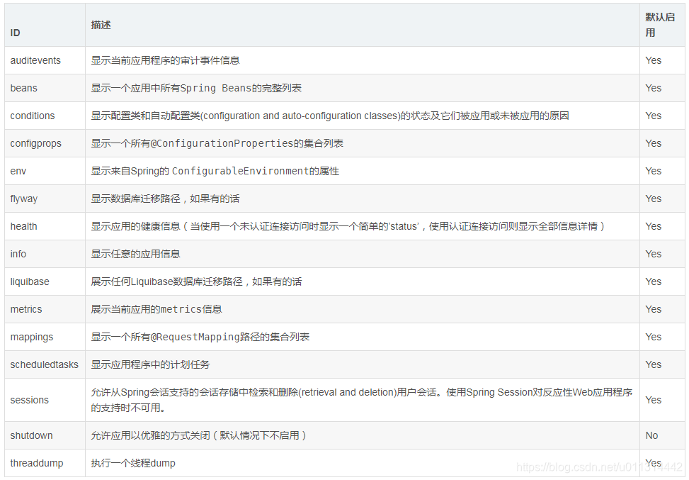 默认除了shutdown以外,所有端点均已启用,要配置单个端点的启用,需要按照下面方式: