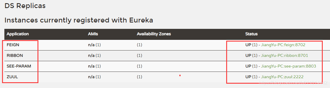 see-param(端口8803)、zuul(端口2222) ,可见 4 个不同服务都已注册成功 。