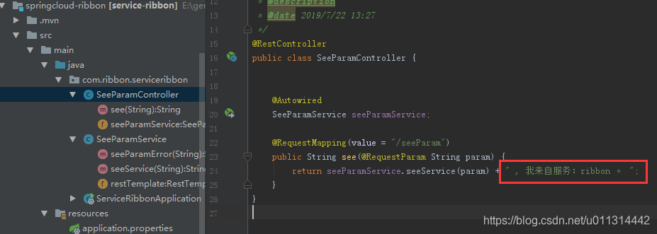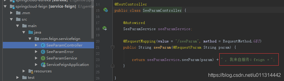 10. 在 feign 、ribbon 工程的 controller 中分别加上一句:“ 我来自服务 xxx ” :