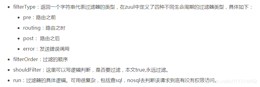 public class JYZuulFilter extends ZuulFilter {@Overridepublic String filterType() {return "pre";}@Overridepublic int filterOrder() {return 0;}@Overridepublic boolean shouldFilter() {return true;}@Overridepublic Object run() throws ZuulException {RequestContext rc = RequestContext.getCurrentContext();if (Objects.isNull(rc.getRequest().getParameter("name"))) {rc.setSendZuulResponse(false);try {rc.getResponse().getWriter().write(" name cannot be null ...");} catch (Exception e) {}return null;}return null;}}