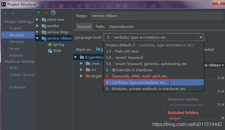 3. 项目 JDK 为1.8 ,故应该设置 Language level 为 8 :