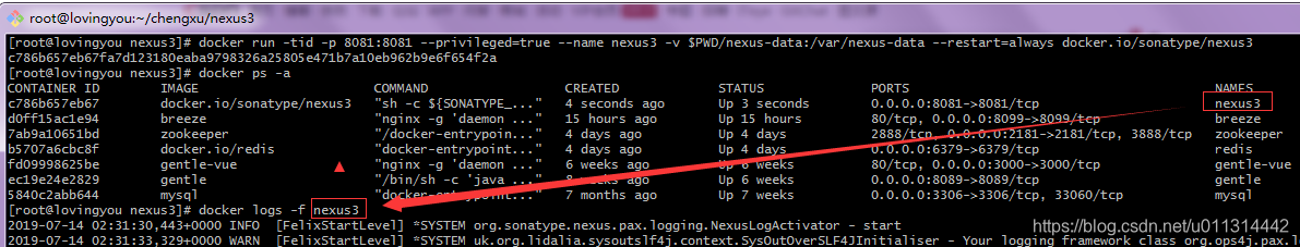 docker run -tid -p 8081:8081 --privileged=true --name nexus3 -v $PWD/nexus-data:/var/nexus-data -v /etc/localtime:/etc/localtime:ro --restart=always docker.io/sonatype/nexus3