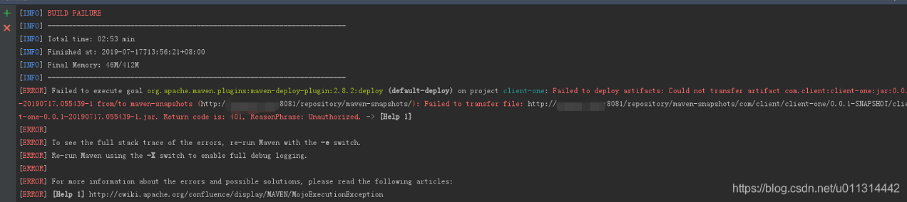 解决方法见文章:解决: Failed to execute ... maven-deploy-plugin... Return code is: 401, ReasonPhrase: Unauthorized.