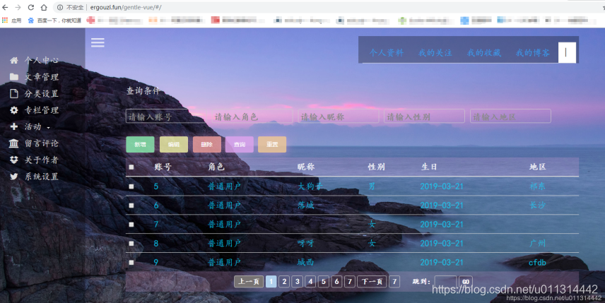 主菜单中主要作了个人中心、文章管理、系统管理 。二级菜单主要作了个人中心中个人资料页面的 CRUD 功能。