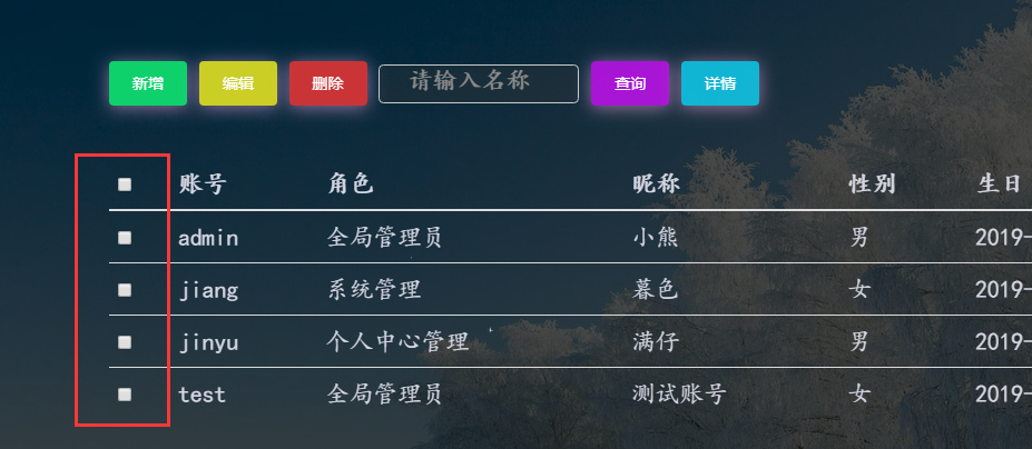 <template><div><table class="table table-hover"><thead><tr><th><!-- 表头中的单选框 --><input type="checkbox" id="selectAll"></th><!-- 循环出表头,用英文的逗号拆分字串 --><th v-for="(item,index) in headerList.split(',')" :key="index">{{item}}</th></tr></thead><tbody><!-- 循环出有多少行数据,即 list 中有多少条数据,得到 list 中的每个元素 --><tr v-for="(item,index) in bodyInfoList" :key="index"><td><!-- 表数据中首列单选框 --><input type="checkbox" class="selectSingle" @click="selectSingle()"></td><!-- 循环取到元素的每个属性,并展示 --><td v-for="(val,index) in item" :key="index">{{val}}</td></tr></tbody></table></div>