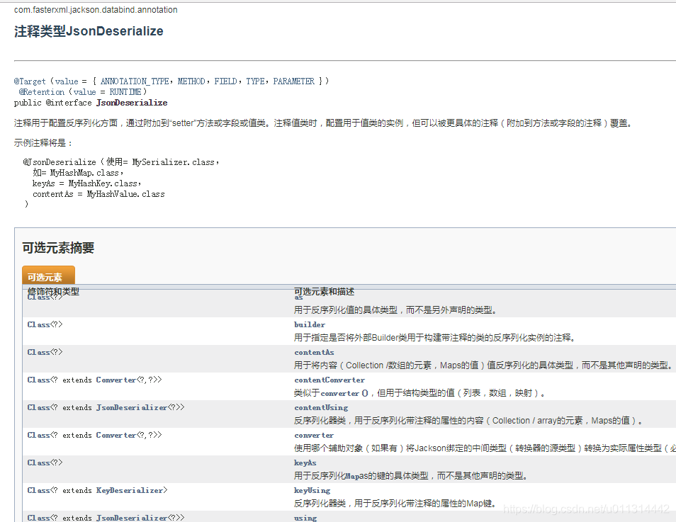 附:@JsonDeserialize使用方法详见:http://fasterxml.github.io/jackson-databind/javadoc/2.2.0/com/fasterxml/jackson/databind/annotation/JsonDeserialize.html
