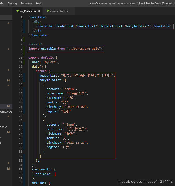 import oneTable from "../parts/oneTable";export default {name: "myCare",data() {return {headerList: "账号,昵称,角色,性别,生日,地区", // 注意:逗号是英文的逗号bodyInfoList: [{account: "admin",role_name: "全局管理员",nickname: "小熊",gentle: "男",birthday: "2019-01-02",region: "成都"},{account: "jiang",role_name: "系统管理员",nickname: "暮色",gentle: "女",birthday: "2012-12-28",region: "广州"}]};},components: {oneTable},methods: {createdFun() {},mountedFun() {this.$ajax.get(this.GLOBAL.BASE_URL + "/gentle/first").then(res => {// data = res.data;console.log(res.data.navList);});}},// 页面加载就执行created() {},// 页面加载完成后执行mounted() {this.mountedFun();}