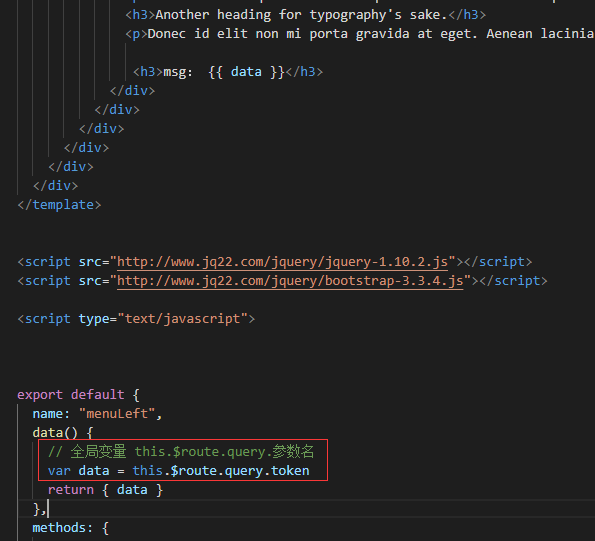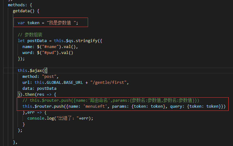 getdata() {var token = "我是参数值 ";// 参数组装let postData = this.$qs.stringify({name: $("#name").val(),word: $("#pwd").val()});this.$ajax({method: "post",url: this.GLOBAL.BASE_URL + "/gentle/first",data: postData}).then(res => {// this.$router.push({name:'路由命名',params:{参数名:参数值,参数名:参数值}})this.$router.push({name: 'menuLeft', params: {token: token}, query: {token: token}})},err => {console.log("出错了:"+err);});}