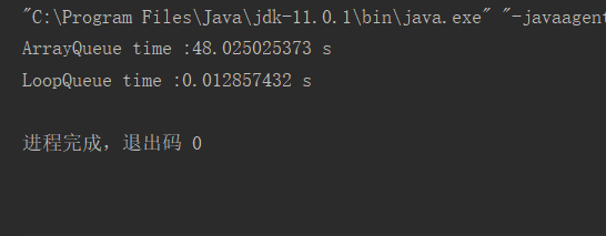 public static void main(String[] args){int opCount = 100000;ArrayQueue<Integer> arrayQueue = new ArrayQueue<>();double timeArray = testQueue(arrayQueue, opCount);System.out.println("ArrayQueue time :" + timeArray + " s");LoopQueue<Integer> loopQueue = new LoopQueue<>();double timeQueue = testQueue(loopQueue, opCount);System.out.println("LoopQueue time :" + timeQueue + " s");}