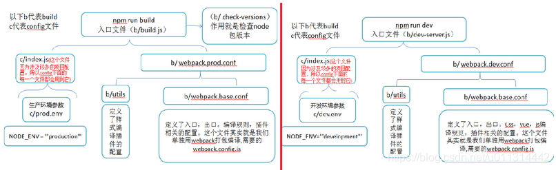大体上就分三层(当然随着你在生成项目配置的参数不同,项目结构可能会有不同),首先package.json里面的devDependencies属性里,包含了构建这个项目webpack所需要的各种依赖node包和执行项目的快捷指令配置,build文件夹是一些和webpack相关的配置,而config是一些和项目相关的配置,关于这两个文件下每个文件具体是干啥的,可以看下这篇文章,我只简单说明一下,在执行命令时,这些文件是怎么组合在一起使用的,也可以理解成执行顺序,可以粗略看看: