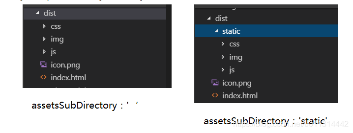 assetsSubDirectory:资源子目录,指js,css,img存放的目录,其路径相对于index.html
