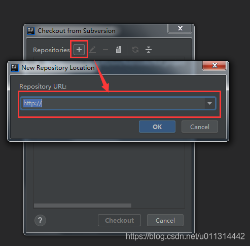 点击 + 号,输入svn 地址。然后检出:选中svn 地址再点击 checkout 就只可以了,会要求输入svn的 账号、 密码。