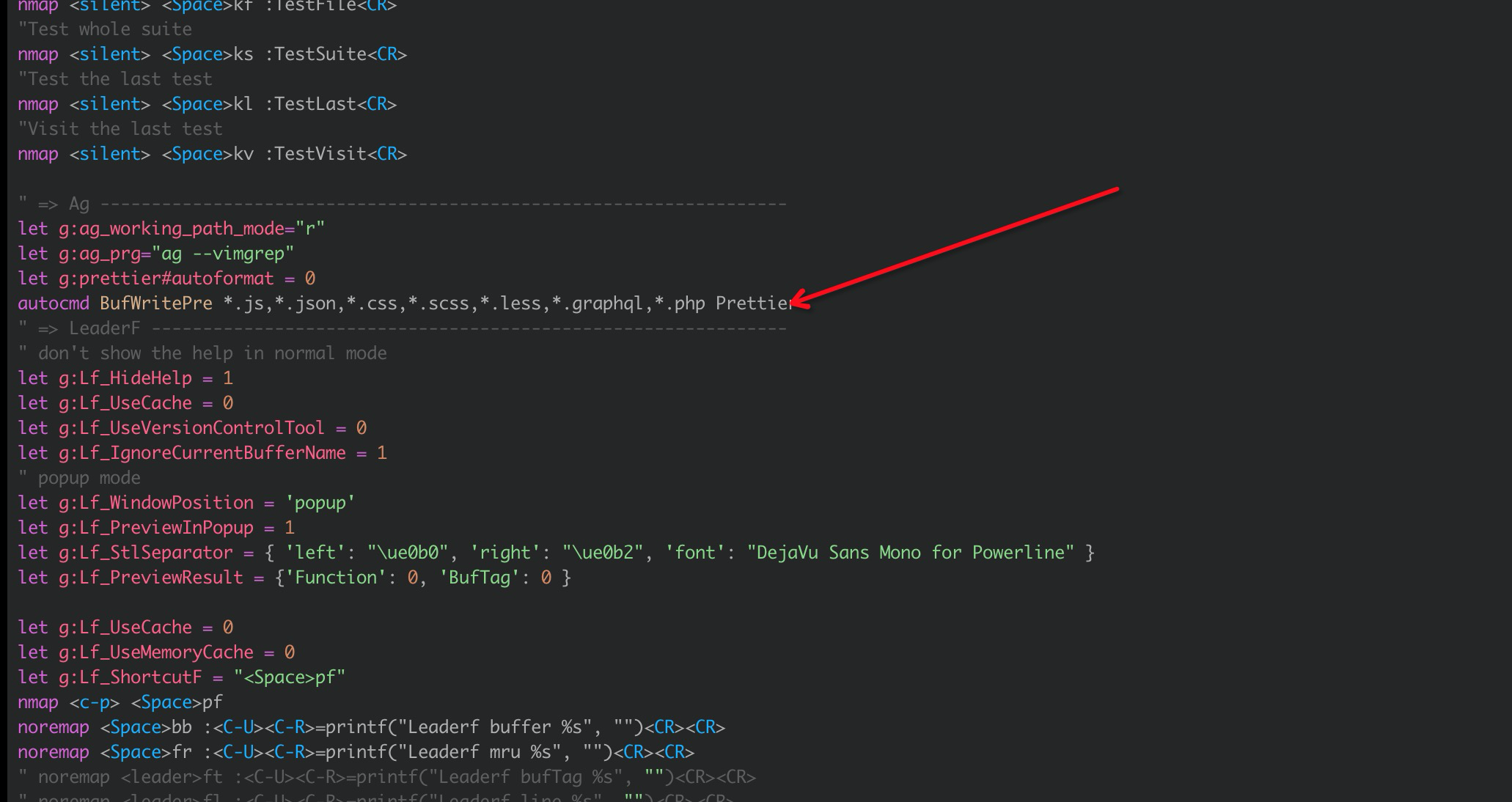 autocmd BufWritePre *.js,*.json,*.css,*.scss,*.less,*.graphql,*.php Prettier