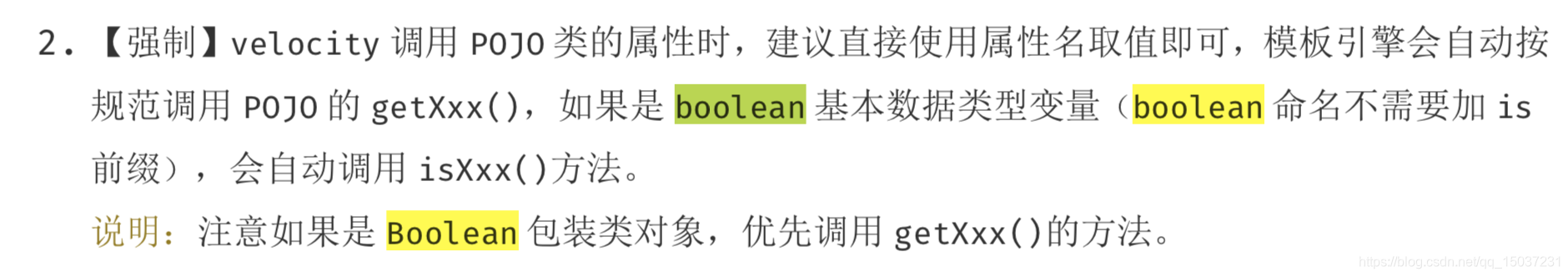 当使用包装类型Boolean时,无论字段名是isGay或者gay都能成功的解析成isGay或者gay,@JsonProperty("isGay")和@JSONField(name = "isGay")也能正常使用,没有任何问题。所以pojo中推荐使用Boolean。同时我们最好遵照阿里的规范,布尔类型字段的命名尽量不要带is。如下说明: