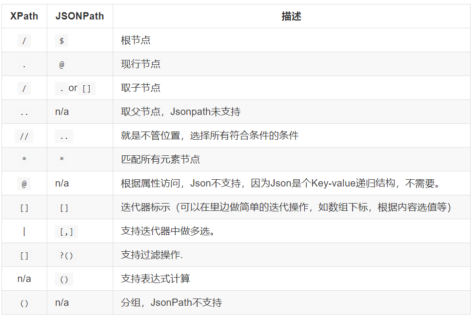 Json结构清晰,可读性高,复杂度低,非常容易匹配,下表中对应了XPath的用法。