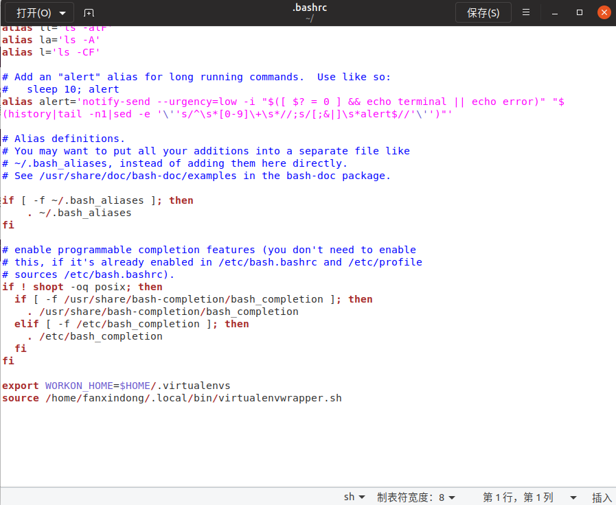 进入home目录,输入命令ls -al,找到.bashrc文件,修改.bashrc文件