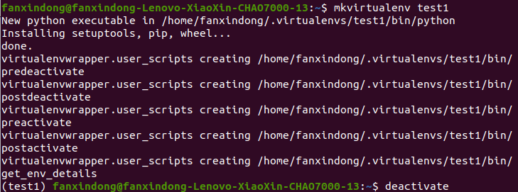 使用  mkvirtualenv  test1  创建一个虚拟环境,如果成功则说明Ubuntu虚拟环境创建成功