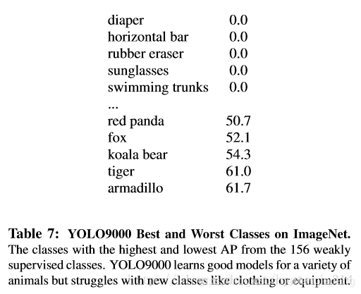 虽然YOLO9000对动物的识别性能很好,但是对类别为”sungalsses“或者”swimming trunks“这些衣服或者装备的类别,它的识别性能不是很好,见table 7。这跟数据集的数据组成有很大关系。