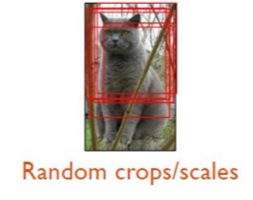 如果训练的时候一直使用尺度和长宽比增强数据增强,在测试的时候也同样做这个变化,随机取32个裁剪图片来测试,也可以在最后的模型上提升一点性能。就是多尺度的训练,多尺度的测试。