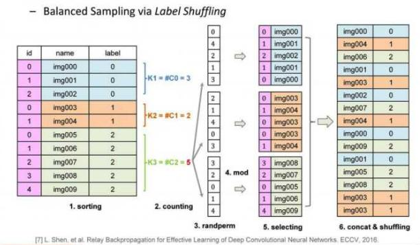 一般根据数据集中的图像最多的种类的数量进行随机采样, 使得每个样本的数量均相等.然后将这些样本图片混合打乱形成新的数据集.