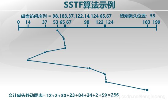 2、SSTF(最短服务时间优先):选择离磁臂当前位置最近的请求执行