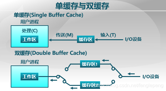 单缓存只有一个缓存区,任意时刻只有一端可以对缓存区进行操作,速度受到限制;双缓存包含两个缓存区,设备与用户进程可以分别操作一个缓冲区,当一个缓冲区1写完并且缓冲区2读完了,可以将两个缓冲区交换,继续操作。