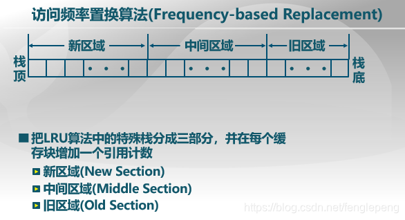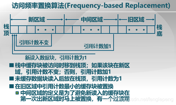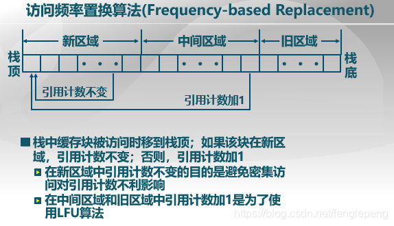 具体实现过程为,维护一个特殊栈(LRU的要求),栈中缓存块被访问时移到栈顶。与LRU不同是栈被分为三个区域:新区域、中间区域和旧区域。如果该块在新区域中,引用计数不变,否则,引用计数加1,在旧区域中找计数最小的块置换出去。这样就将LRU与LFU结合在一起,并且避免了密集访问的影响。