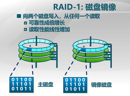 同时向两个磁盘写入相同的数据,可靠性成倍增长,读取性能线性提升