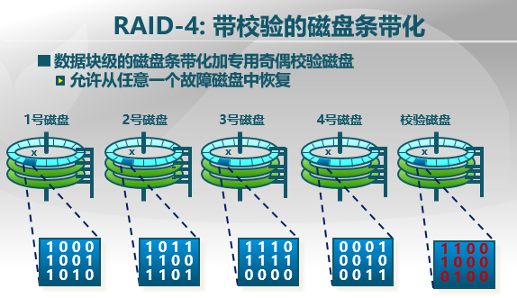 数据块级的磁盘条带化加专用奇偶校验磁盘,一个磁盘专用于奇偶校验,允许只有一个磁盘发生故障时进行数据恢复