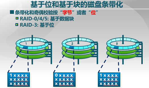 把数据块分成多个子块,存储在独立的磁盘中,通过独立磁盘上并行访问数据块提供更大的磁盘带宽