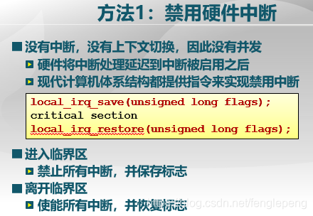 - 禁用中断后,进程无法被停止。整个系统都会为此停下来,可能导致其他进程处于饥饿状态