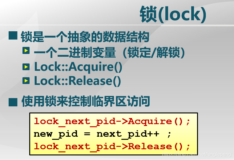 锁是一个抽象的数据结构,由一个二进制变量(锁定/解锁)和两个操作原语(锁的请求和锁的释放)组成。二进制变量用于标志锁的状态,锁的请求使锁在被释放前一直等待,并且使进程得到锁,这两者是原子的,释放锁时唤醒其他等待锁的进程。