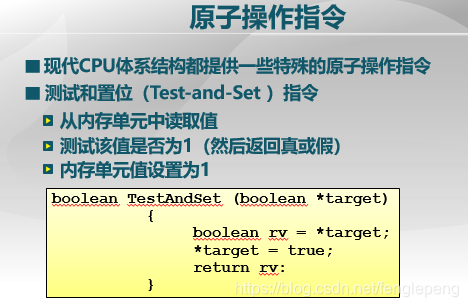 内部基于CPU体系结构提供的一些特殊的原子操作指令,这些指令把若干个指令合并为一次原子操作,保证不会出现部分执行的状态。这些原子操作指令包括测试和置位指令(Test-and-Set,即TS指令,返回内存地址中的值,并将其置为1)、交换指令(交换内存中的两个值)。