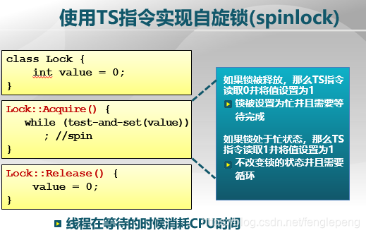 基于TS指令可以实现如下图所示的自旋锁,自旋锁的缺点是线程等待时消耗CPU时间。