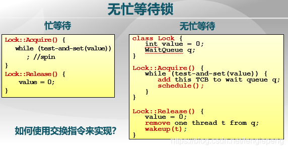 针对自旋锁的问题,出现了无忙等待锁,当锁已经被占用时,将自身线程放入等待队列,并调用调度程序。当其他线程释放锁时会将所有等待中的线程重新唤醒。