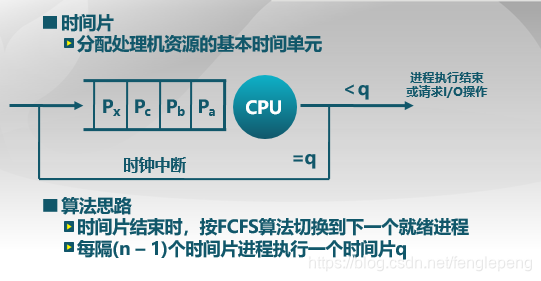 算法思路:用时间切片和抢占来轮流执行,强调了公平。在量子切片/时间切片的离散单元中分配处理器,时间片结束时切换到下一个准备好的进程