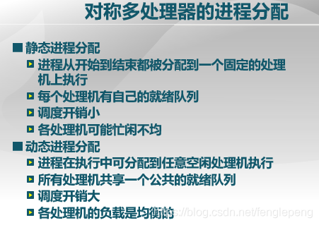 多处理机是指由多个处理机组成一个多处理机系统,处理机之间可以实现负载共享。其中每个处理器有自己的调度程序,调度程序对共享资源的访问需要进行同步。多处理机调度策略中最重要的一点是一个进程应该分配给哪一个处理机。静态进程分配是进程从开始到结束都分配到一个固定的处理机上执行,之后就是在每个处理机上的单处理机调度算法,但这会导致处理机利用率不均。动态进程分配则是一个进程可以分配到任意空闲处理机执行,所有处理机共享一个就绪队列,调度开销较大,但负载均衡。