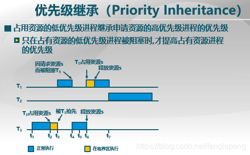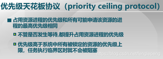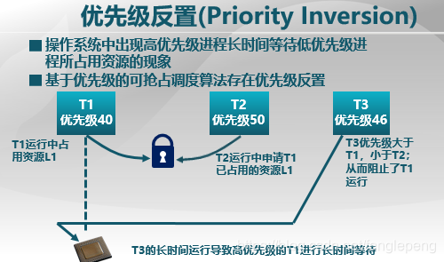 优先级反置是指高优先级进程要请求的资源被低优先级进程占用而被阻塞,此时中优先级进程反而抢占了CPU导致高优先级进程始终无法运行。针对这一现象有两种解决方案:一是优先级继承,导致高优先级进程阻塞的低优先级进程会暂时继承高优先级进程的优先级,避免被中间优先级进程抢占;二是优先级天花板协议,占有资源的进程和所有可能申请该资源的进程的优先级比较,设置成其中最高优先级对应的优先级,这样就不会有进程阻止他使用这个资源,可能会出现优先级滥用的情况。