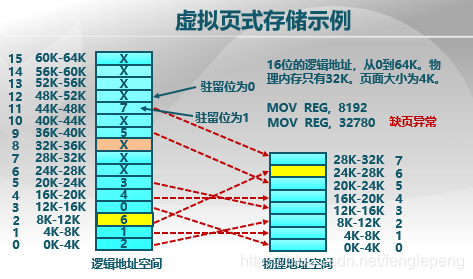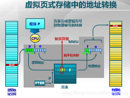 在页式存储管理的基础上,增加请求调页和页面置换。具体思路是当用户程序要装载到内存运行时,只装入部分页面就启动程序运行。进程在运行中发现有需要的代码或数据不在内存时,则向系统发出缺页异常请求。操作系统在处理缺页异常时,将外存中相应的页面调入内存,使得进程能够继续运行。如下图所示,在页表中加入标志位,当发现缺页时触发缺页异常,操作系统接管,找到相应页面置入内存,并将标志位修改为有效。