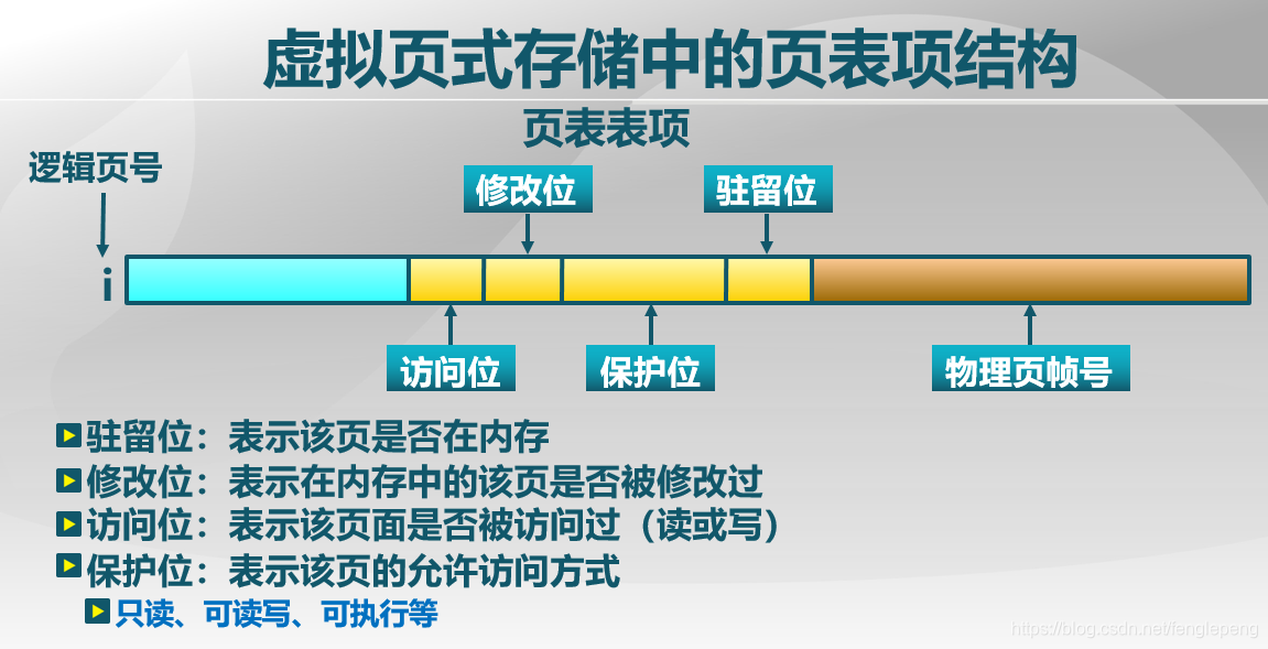 虚拟页式管理中,页表项结构有相应调整,如下图:增加了几个标志位。其中驻留位用来表示是否在内存中;修改位表示在内存中的该页是否被修改过,因为如果没有修改过而外存中又有这一页面时不需要置换,直接作废该页表项即可,如果被修改过则需要重新置换;访问位表示该页是否被访问过(读或写),用于置换算法,用于近似统计是否经常访问;保护位表示该页的允许访问方式,如可读可写。