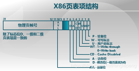 下面是X86 32位系统以4K为页帧大小时的页表项结构:帧号项占20位,标志位中除了前面提到的驻留位、可写标志、访问位、修改位,还有几个没提到过的。一个是用户态标志,表示用户态是否可以访问;保留位,用于扩展,比如现在很多32位系统不仅支持4G内存;CD位,缓存是否有效,是否允许启用高速缓存;WT是否写通。