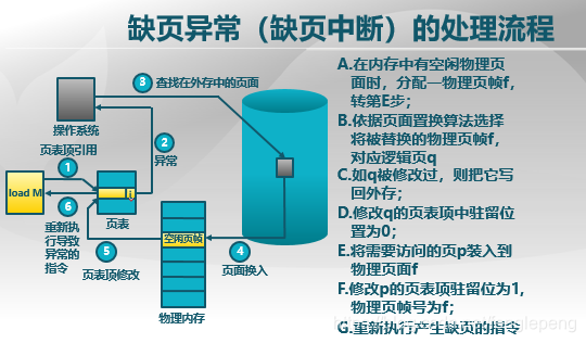 执行命令时CPU给出需要的逻辑地址,查找页表;发现缺页,产生缺页异常;操作系统启用缺页异常例程,查找页面在外存中的位置;从物理内存中找空闲页帧并将页面换入空闲处;将页表项修改为有效;重新执行导致异常的指令。