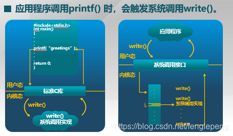 首先看一个标准C库的例子:当我们程序中使用了C库中的printf()函数,实际在底层是在内核态中调用了write()函数。图中右侧则是将程序代码与C库都算到应用程序中,内核提供了一个系统调用接口。
