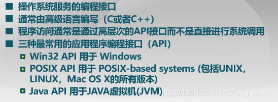 3. 程序访问通常是通过高层次的API接口(比如C库)而不是直接进行系统调用。最常见的三种:1. Windows下的Win32 API;2. POSIX-based系统(包括UNIX、LINUX、Mac OS等)下的 POSIX API;3. JAVA虚拟机中的Java API。